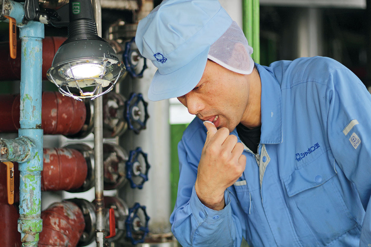 こうして製造される同社の無添加石けんは、ケン化釜で加熱・熟成して作られるが、目で見るだけでなく、音やにおい、味や手ざわりを確認しながら五感をフルに働かせて、石けんの微妙な変化を調整していくことが必要となる。湿度や温度によっても仕上がりが変わるため、毎日、指先で粘り気を確かめ、口で味見している。一定の品質を守るためには熟練の経験が必要で、その製造には、熟練技術者の五感に頼る部分が大きいともいえる。