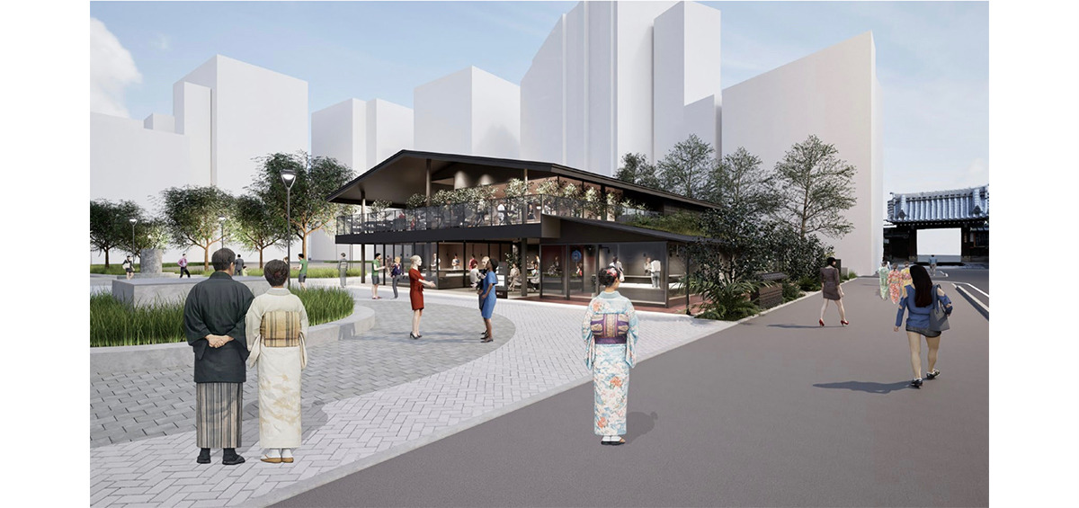 施設は和を基調とした2階建てで、1階には観光案内スペースやカフェなどを設置。明太子づくりが体験できる「明太子道場」のほか、近隣の承天寺がうどん発祥の地とされることにちなんだ「うどん道場」を実施する。2階の多目的スペースでは、伝統工芸品の展示や文化・歴史を学べるイベントなどを計画。災害時の拠点となるよう施設内に防災倉庫を設け、地域の安全・安心につなげる。