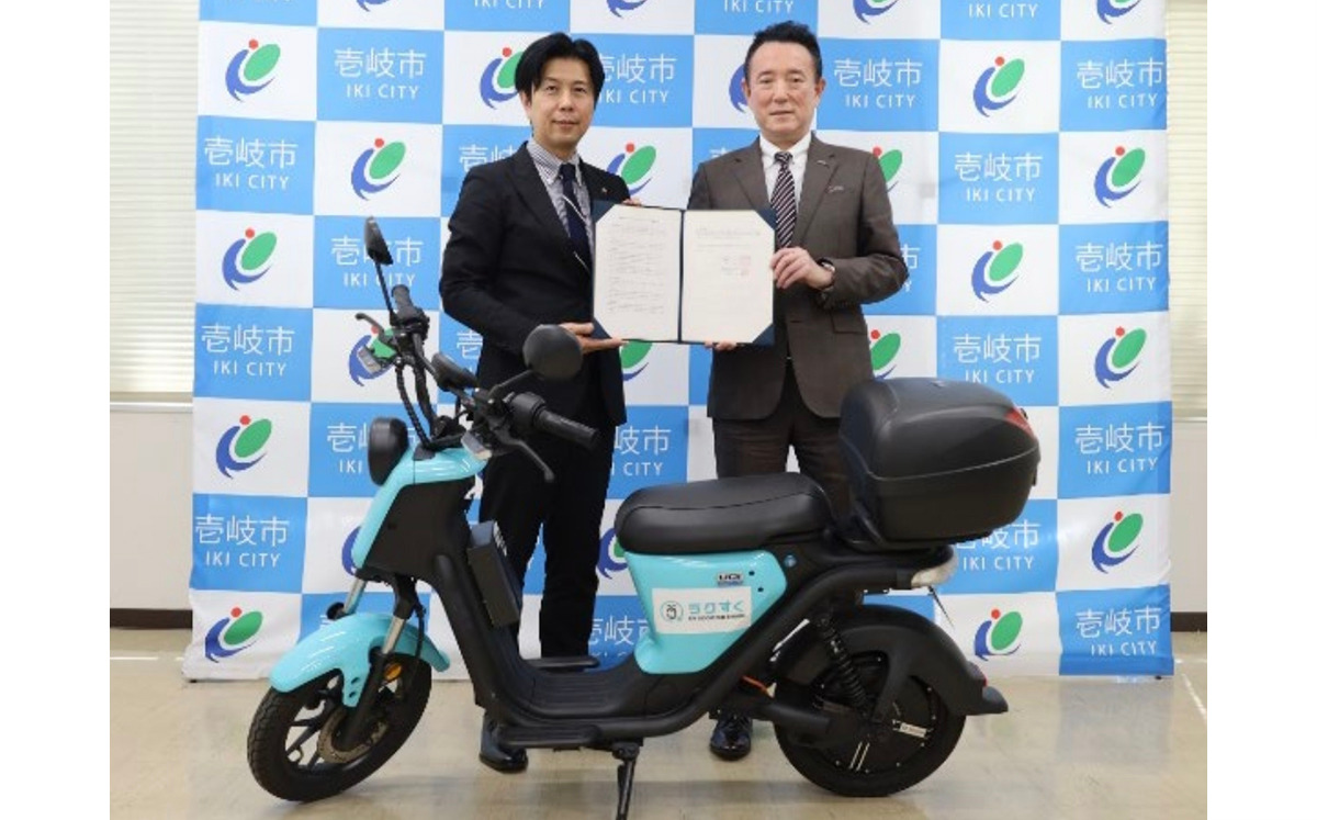 新出光(福岡市)は4月9日、同社が運営するEVスクーターのシェアリングサービス「ラクすく」について、長崎県壱岐市とエンゲージメントパートナー協定を締結したと発表した。ラクすくを活用し、観光客や地域住民に移動手段を提供する。二次交通不足などの課題を解決し、島内の豊かな自然を守りながら地域活性化を目指す。