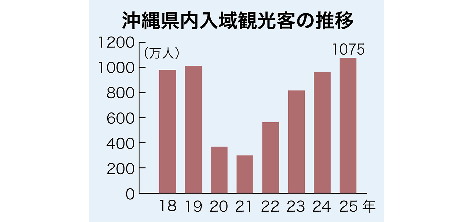 沖縄県が発表した2025年(1〜12月)の入域観光客数(速報値)は、前年比11.2%増の1075万5800人だった。これまで最多だった19年(1016万3900人)を上回り、過去最多を更新した。国内客は過去最多となり、外国客も航空路線の新規就航や再開などで過去3番目の水準だった。