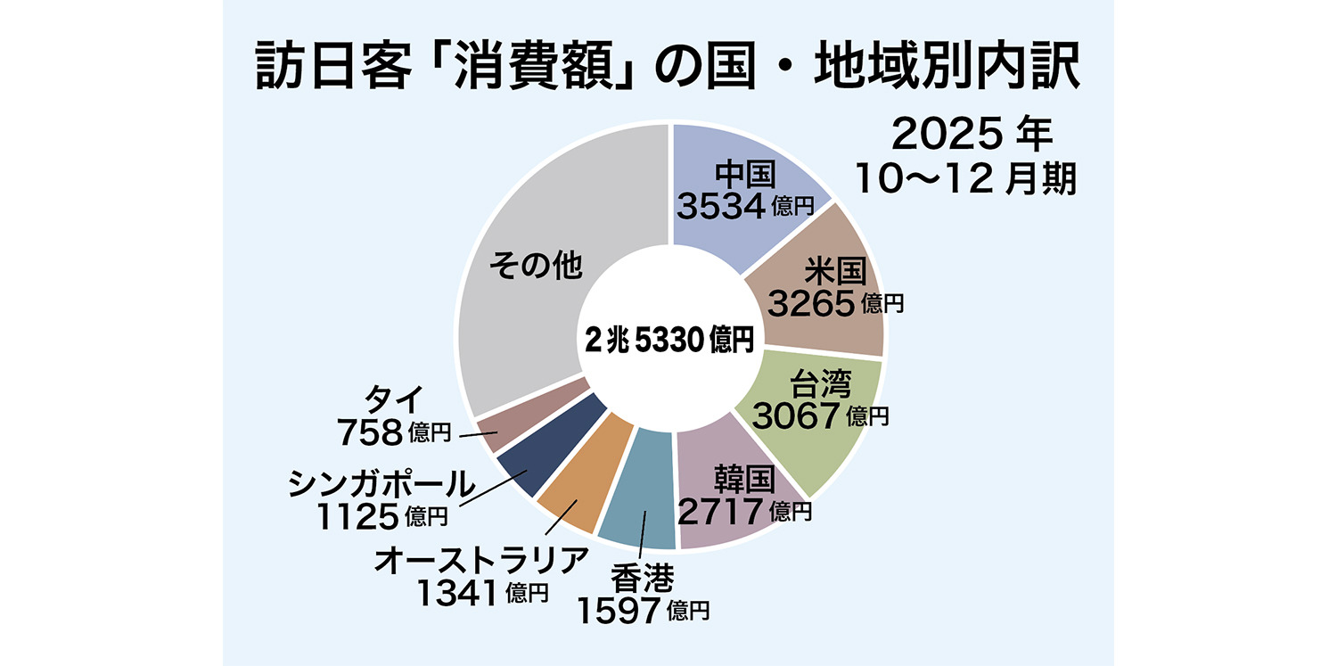 一方、25年のインバウンドの年間消費額(速報値)は、前年比16.4%増の9兆4559億円で過去最高だった。中国が2兆26億円で全体の21.2%を占めた。台湾が1兆2110億円、米国が1兆1241億円の順。