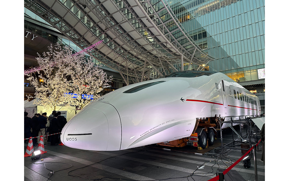 JR九州(福岡市)は4月10日、2016年4月の熊本地震で被災した九州新幹線「つばめ」の1号車の展示を福岡市のJR博多駅前広場で始めた。熊本総合車両所(熊本市)に保管されていた車両を熊本港から海上輸送した。九州新幹線の全線開業15周年プロジェクト「つばめの大冒険」の一環で、19日まで一般公開される。