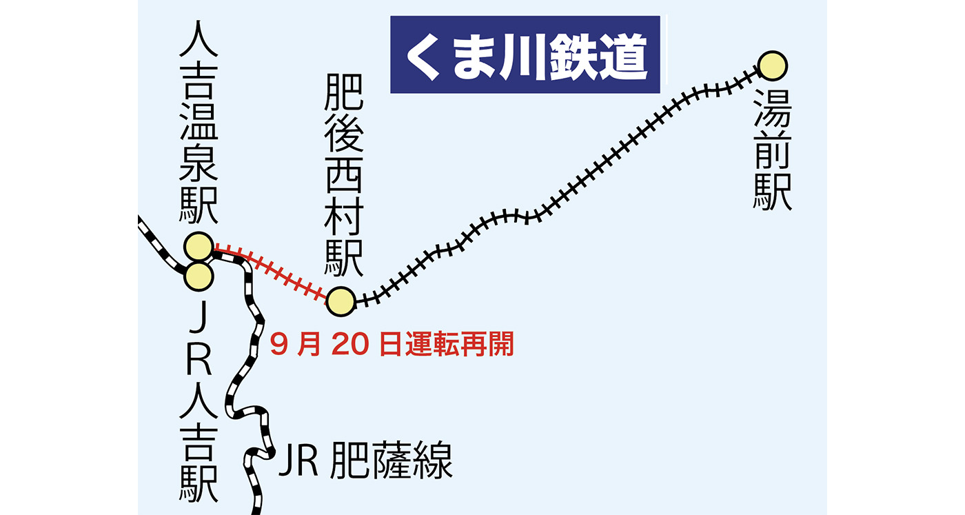 くま川鉄道は、人吉温泉(人吉市)と湯前(湯前町)を結ぶ全長24.8キロ。21年11月に肥後西村(錦町)—湯前の18.9キロが再開し、人吉温泉—肥後西村間の5.9キロで運休が続いていた。運営は上下分離方式が決まっており、くま川鉄道が運行し、県と沿線10市町村でつくる一般社団法人「くま川鉄道管理機構」が車両や施設の保有、維持管理などを担う。開始時期は未定。