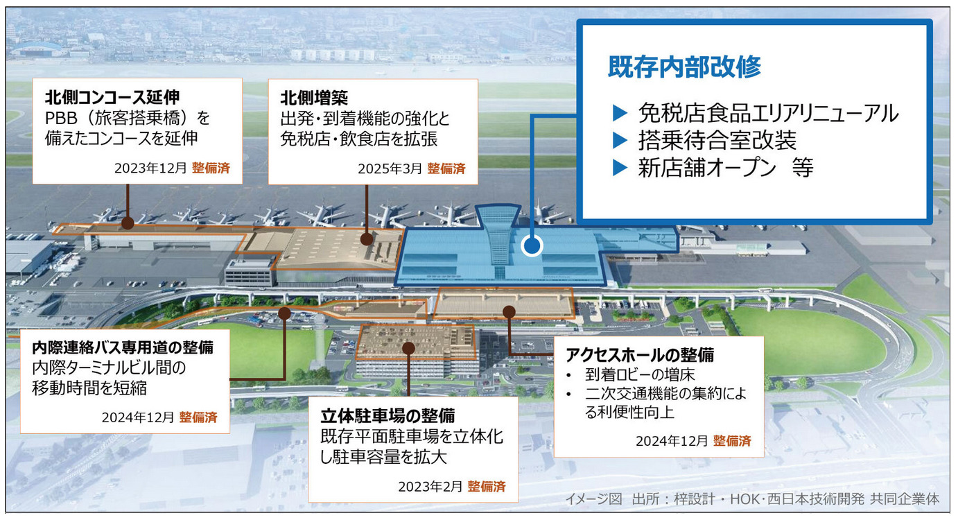 福岡空港を運営する福岡国際空港(福岡市)は11月6日、2022年5月から行ってきた国際線ターミナルビルの増改築工事が12月20日に完了すると発表した。11月18日に免税店食品エリアがオープンし、広さは仮設エリアの約3倍となる。地元のチョコレートショップや元祖博多めんたい重などが新たに出店し、東京や京都、北海道の菓子店など57ブランドが入る。12月20日に搭乗待合室の改装工事が完了し、増改築工事が全て完了する。