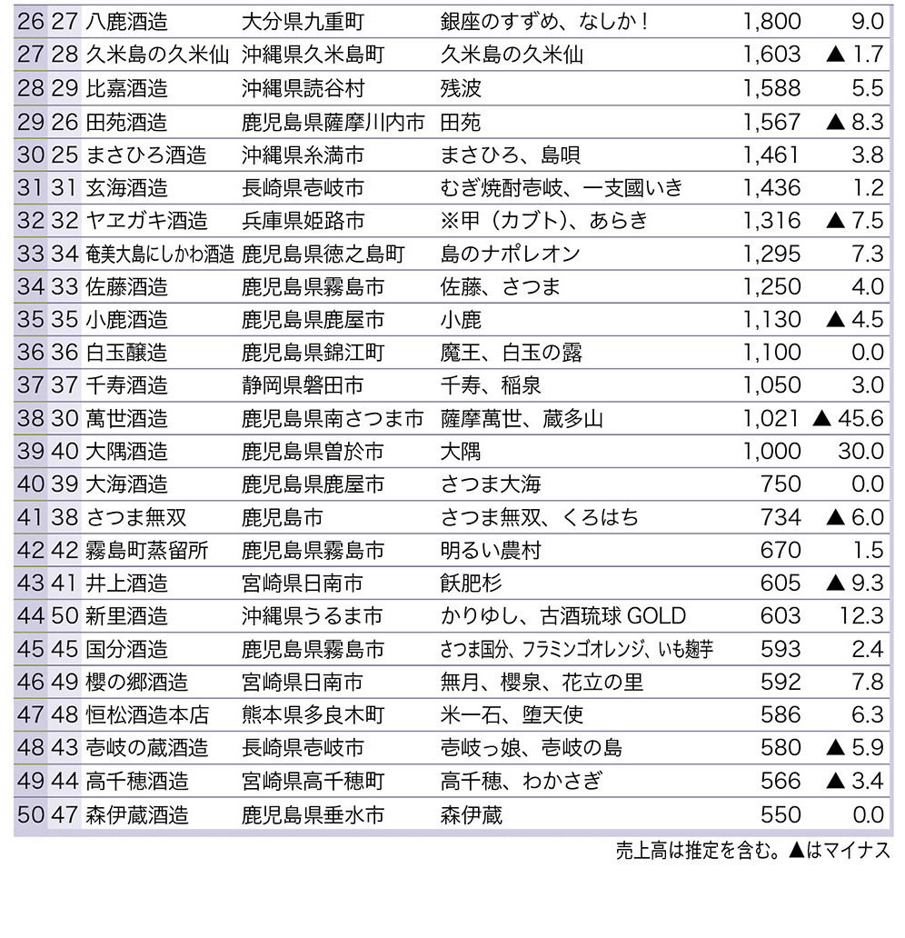 帝国データバンク福岡支店は、2024年の焼酎メーカーの売上高ランキングを発表した。上位50社の合計売上高は前年比1.6%減の2228億円で、2年ぶりに前年を下回った。若者のアルコール離れに伴う市場縮小に加え、最大手の霧島酒造(宮崎県霧島市)がサツマイモ基腐(もとぐされ)病の影響で減収となったことが響いた。調査は、売上高に占める焼酎の割合が5割以上の全国のメーカーを対象に、24年1~12月の決算期で集計した。