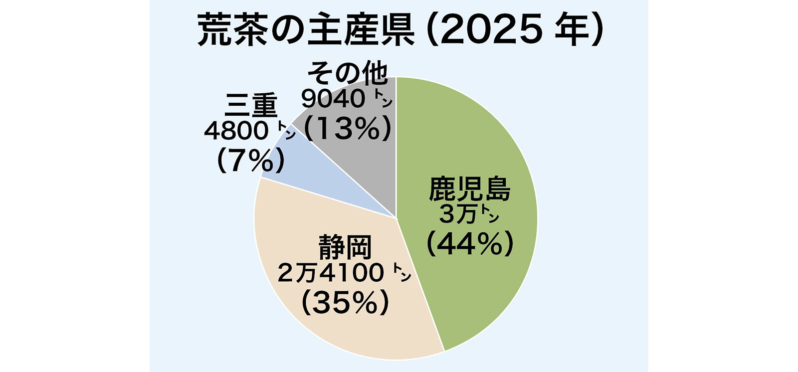 農林水産省が発表した2025年の荒茶生産量で、鹿児島県が2年連続で全国1位となった。荒茶は収穫した茶葉(生葉)に乾燥などの加工処理を加えたもの。鹿児島県の生産量は前年度比11%増の3万トン、2位の静岡県は同7%減の2万4100トンと両県の差が拡大。長年続いた静岡優位の構図を覆して「かごしま茶」の躍進が示された形となった。