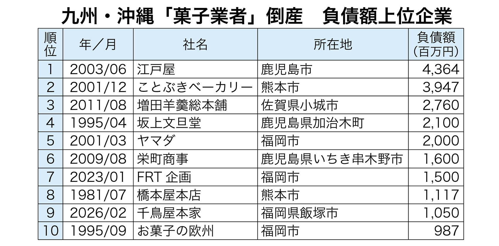 東京商工リサーチ福岡支社のまとめによると、九州・沖縄の菓子業者(製造、卸売り、小売り)の2月の倒産は6件で、1976年以来、単月では過去最多となった。千鳥屋本家(福岡県飯塚市)などグループ4社が民事再生法の適用を申請し、話題になった。25年度の累計件数は16件に達し、1カ月(3月)を残して、これまで最多だったコロナ禍の20年度の14件を超えた。