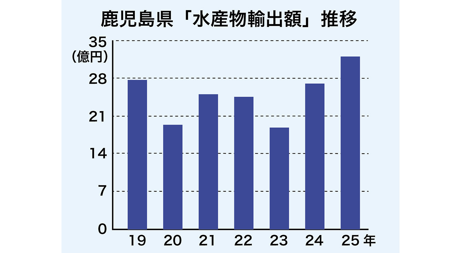 長崎税関鹿児島税関支署のまとめによると、2025年の鹿児島県からの水産物と加工品の輸出額は32億700万円で、初めて30億円を超えた。世界的な和食ブームを追い風に、養殖収穫量が全国トップのブリやカンパチが好調だった。政府は農林水産物・食品の輸出額を30年までに5兆円とする目標を掲げており、ブリは牛肉などと並ぶ輸出重点品目に位置付けられている。
