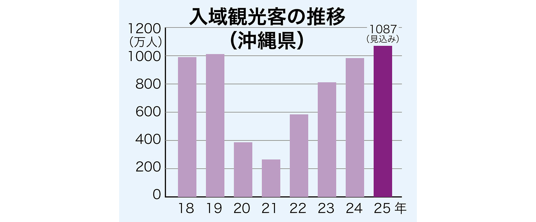 沖縄観光コンベンションビューローは、2025年の入域観光客数が前年比11.1%増の1087万5600人となる見通しだと発表した。実現すれば、コロナ禍前の19年(1016万3900人)を上回り過去最高となる。航空需要が堅調に推移し、国内客、海外客ともに増加。空路は990万8200人、海路は96万7400人を見込む。