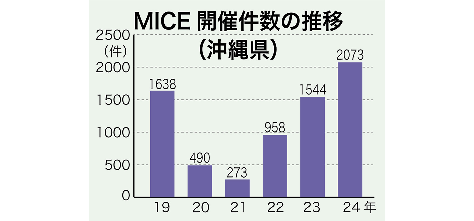 沖縄県が発表した2024年の県内のMICE(大規模会議や展示会)開催件数は、前年比34%増の2073件、参加人数は28%増の121万1156人で、いずれも過去最多だった。経済効果も28%増の約473億円で過去最高。受け皿となる大型ホテルの増加などが要因。