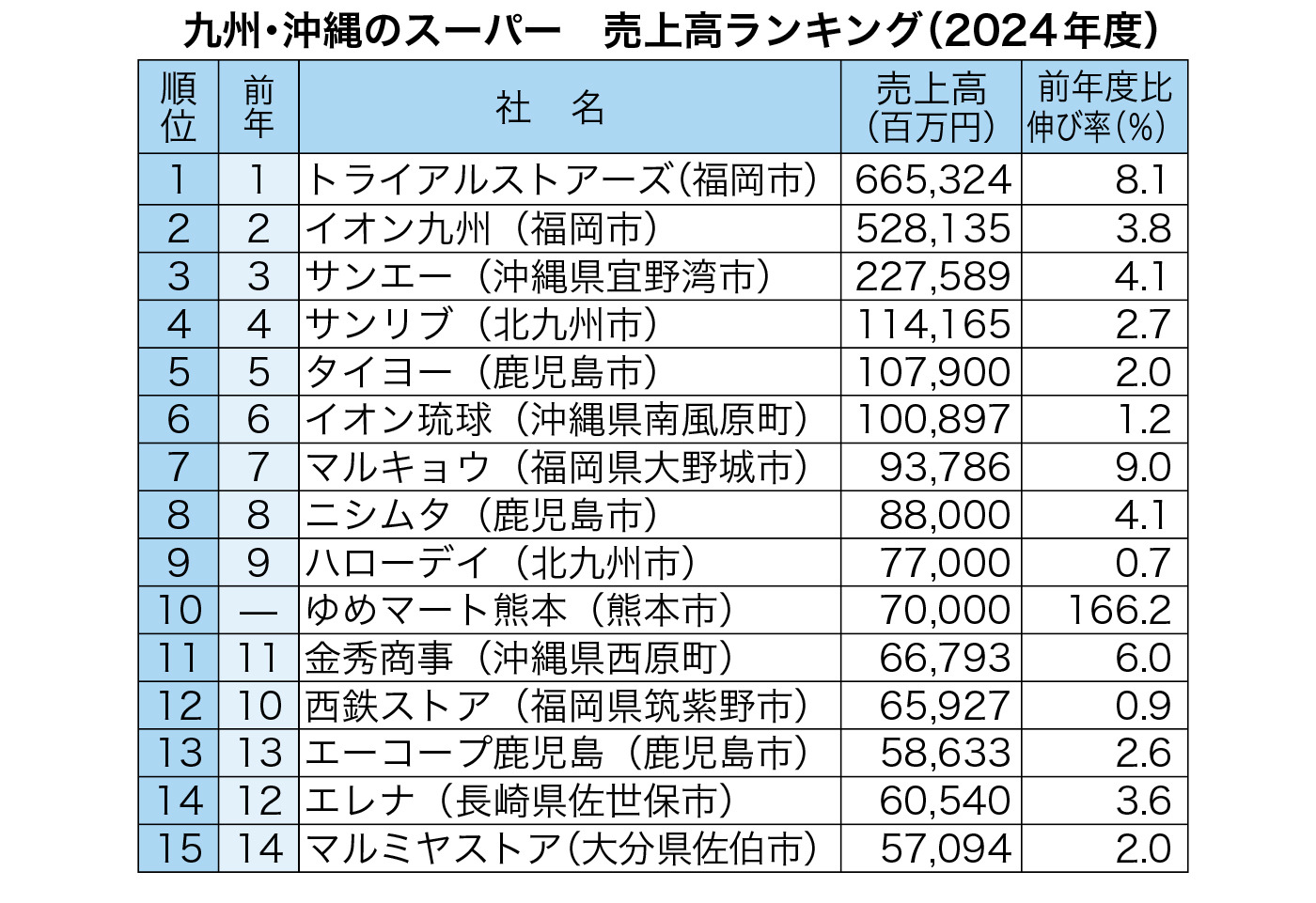 売上高トップは2年連続でトライアルストアーズ(福岡市)。店舗数が33店増の318店となり、消費者の節約志向を背景に売上高は8.1%増の約6653億円となった。2位はイオン九州(同市)。都市型小型店の出店やイオンモール香椎浜など既存店の改装などで、売上高は3.8%増の約5281億円。3位のサンエー(沖縄県宜野湾市)は、外国人観光客の増加などで売上高は4.1%増の約2275億円だった。10位のゆめマート熊本(熊本市)は、西友が九州で展開していた「サニー」(69店舗)を24年8月に承継し、売上高は2.6倍となった。