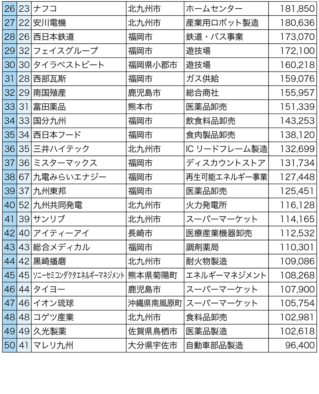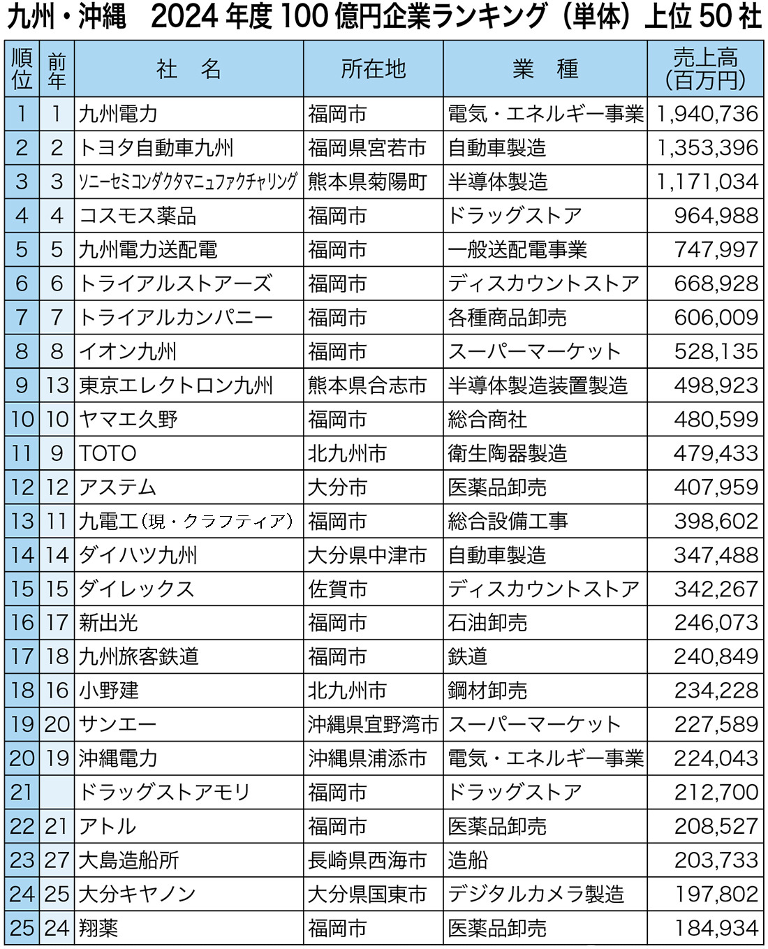 売上高トップは九州電力(福岡市)で48年連続。2位のトヨタ自動車九州(福岡県宮若市)、3位のソニーセミコンダクタマニュファクチャリング(熊本県菊陽町)の3社が前年に続き1兆円を超えた。上位8位までの顔ぶれは前年と同じ。業種別の社数は、「建設」(79社)、「サービス・運輸」(195社)、「小売」(105社)、「卸売」(215社)の4業種で増加し、「製造」(203社)と「遊技場」(24社)の2業種が減少。売上総額では、遊技場を除く5業種で増収となった。建設の売上増加率は15・4%と全業種で最大で、防衛関連や半導体関連投資、再開発事業がけん引した。県別では、福岡、熊本、沖縄の3県が社数・売上総額ともに過去最高を更新したほか、長崎の売上総額が過去最高となった。新たに100億円企業となったのは44社(前年度は42社)で、4年連続で増加した。