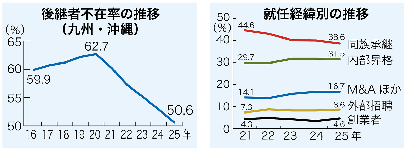 帝国データバンク福岡支店は、2025年の九州・沖縄企業の後継者問題に関する調査結果をまとめた。後継者が「不在」の割合は前年比2.3ポイント低下の50.6%となり、16年以降では最も低かった。5年連続で改善傾向が続き、最高だった20年に比べると12.1ポイントの大幅低下となった。これまで最も多かった親族間の承継から社内外の第三者へ経営権を移譲する「脱ファミリー」の動きが加速している。
