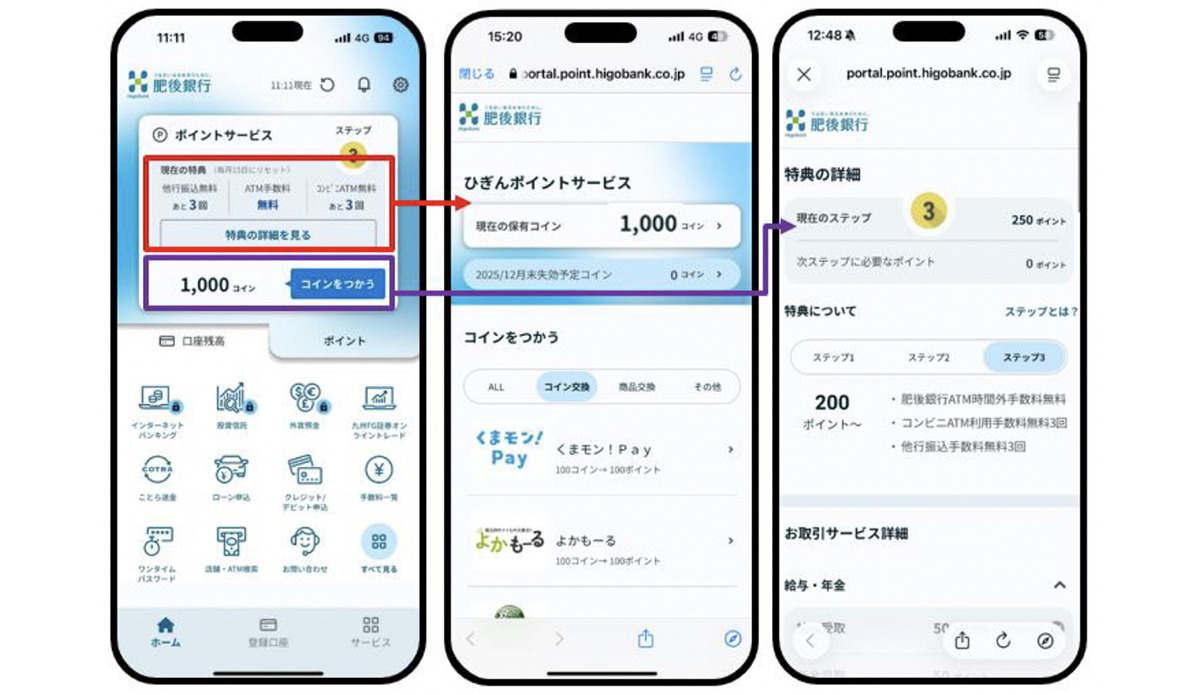 新サービスでは、ウェブ口座の開設や定期預金の残高などに応じて「ひぎんコイン」が毎月付与される。コインは同行のアプリ内で確認でき、スマートフォン決済「くまモンペイ」や「PayPay」などのポイントに交換できる。また、25歳以下の顧客が特典を受けやすくなる仕組みを導入している。同行は、ポイントサービス会員を数年後に60万人に増やす目標を掲げる。