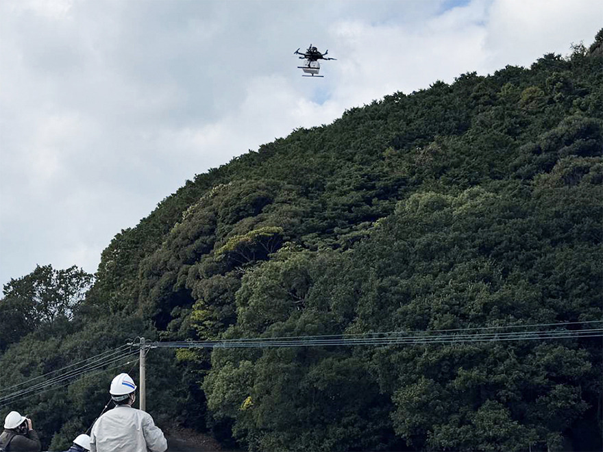 同社は2021年に設立。五島列島で「レベル3」飛行(無人地帯での目視外飛行)による医薬品や日用品・食品の配送事業を行っている。今回の実証では、長崎県が昨年指定された国家戦略特区の規制緩和策を活用。約4.2平方キロの範囲で包括飛行許可を得て実施した。海沿いの離着陸地点から、市街地にある上五島病院と新上五島町役場に1往復ずつ飛行し、荷物を運んだ。医薬品卸の翔薬、東七、藤村薬品、宮崎温仙堂商店の4社も実証に協力した。