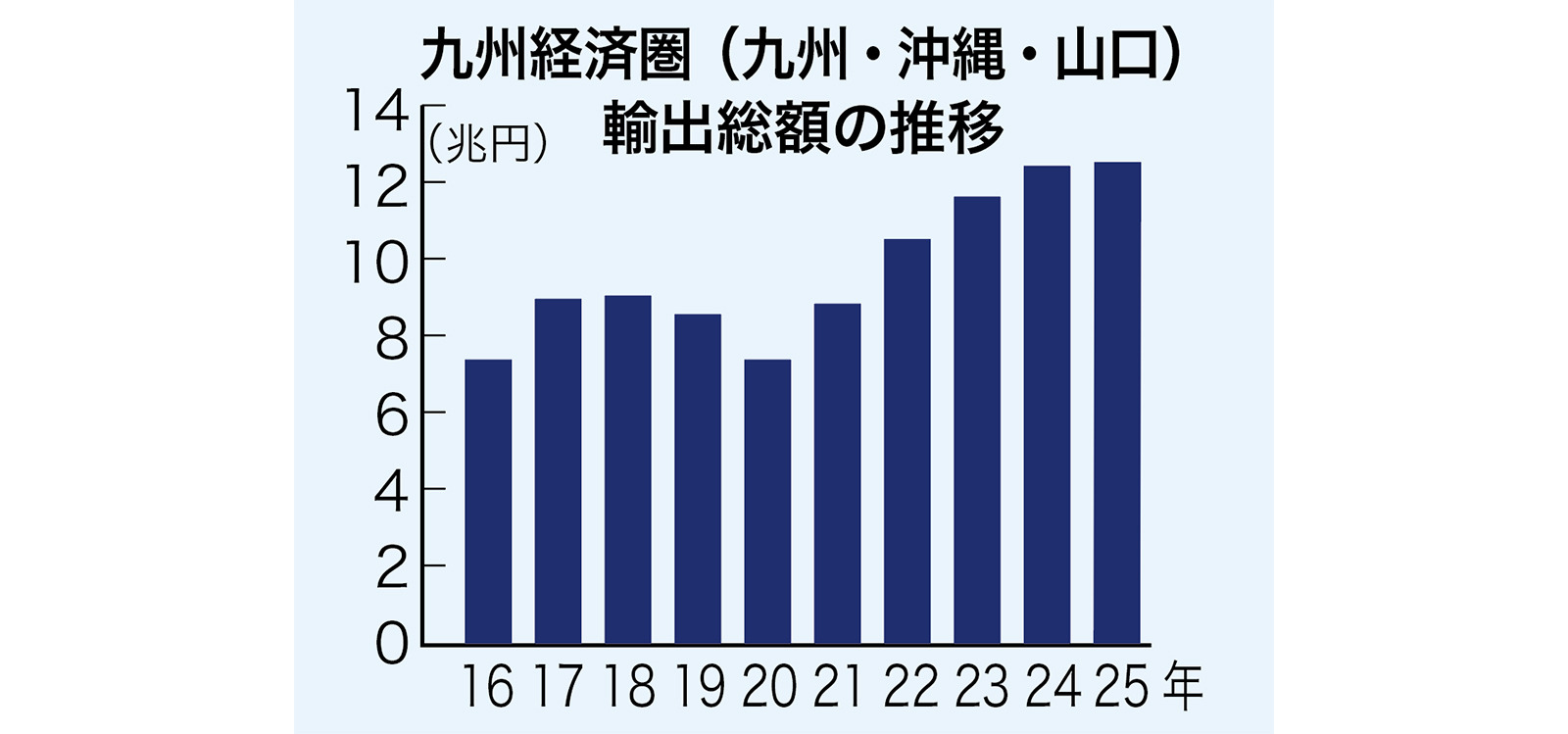 門司税関は1月22日、2025年の九州経済圏(九州・沖縄・山口)の貿易統計(速報値)を発表した。輸出総額は前年比0.7%増の12兆5169億円で、5年連続で増加した。米国の関税措置などで主力の自動車が落ち込んだが、半導体などの電子部品や半導体製造装置が自動車の落ち込みを補った。