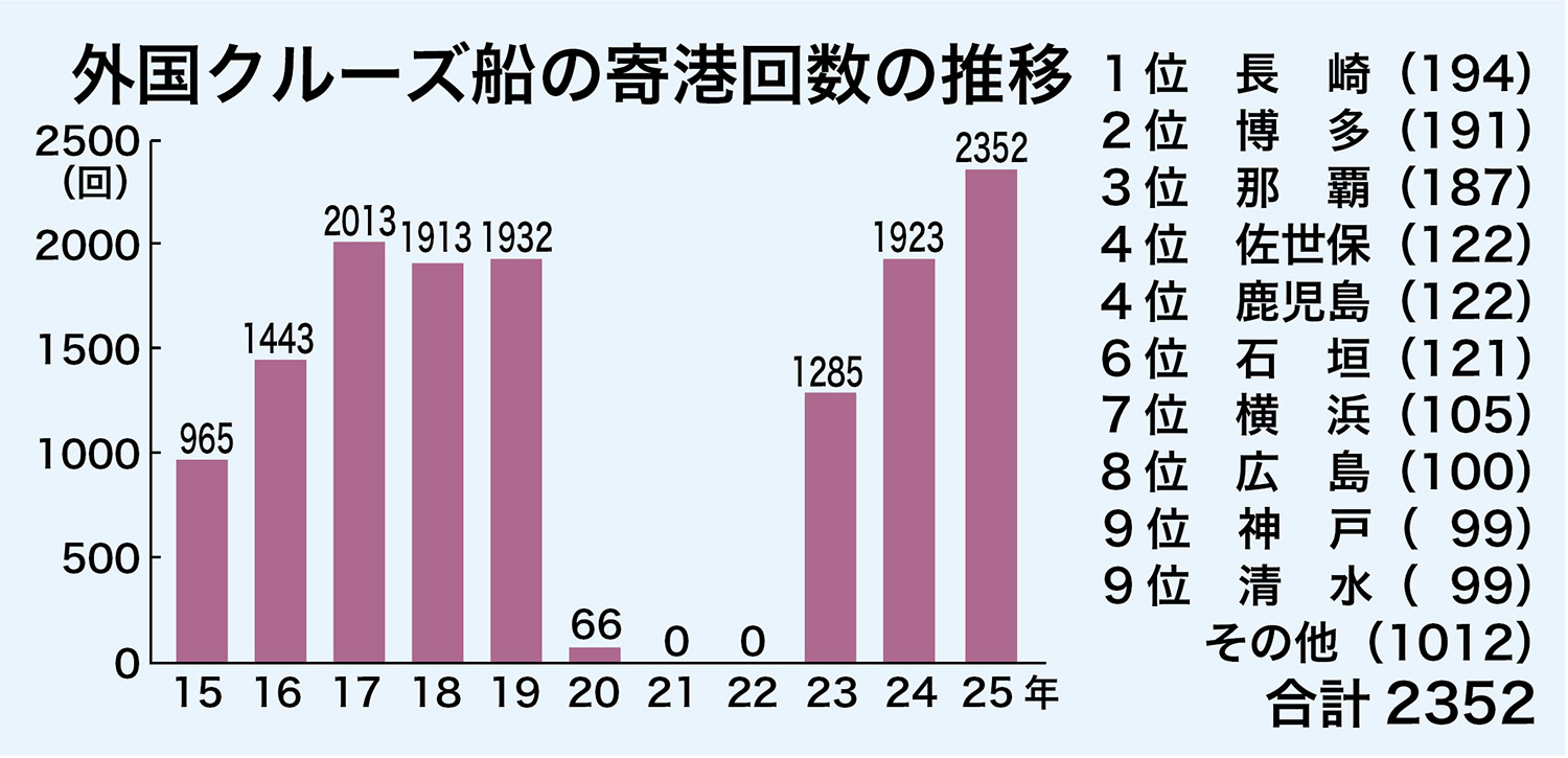 国土交通省は2月20日、2025年の外国クルーズ船の国内港湾への寄港回数は前年比1.2倍の2352回だったと発表した。港湾別のトップは長崎(194回)で、前年の3位から順位を上げた。2位は前年トップの博多(191回)、3位は那覇(187回)、4位は佐世保と鹿児島(いずれも122回)、6位が石垣(121回)と続いた。