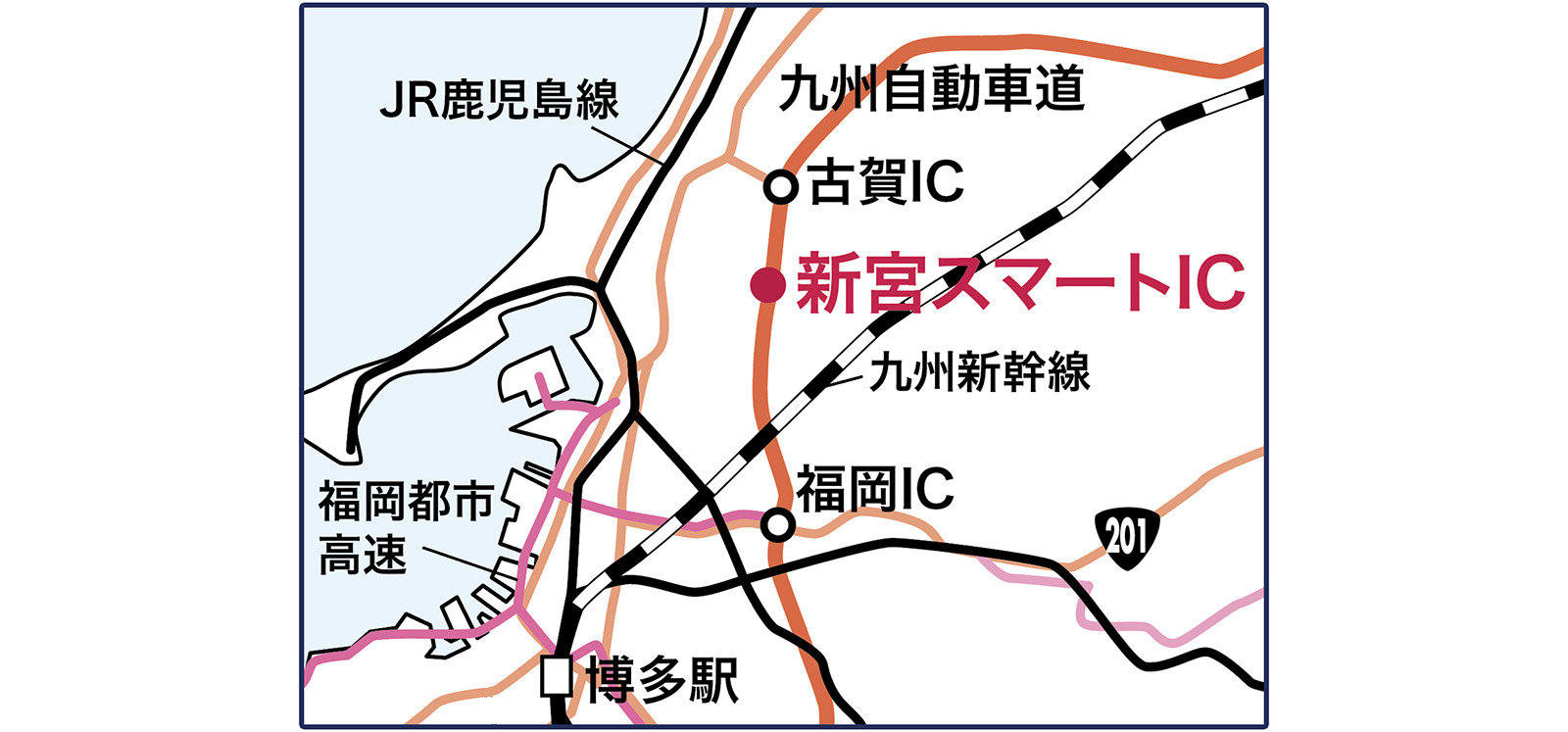新宮スマートICは、古賀ICの南側3キロに設置予定。自動料金収受システム(ETC)専用で、24時間通行できる。事業は西日本高速道路と新宮町が実施する。用地買収や基本設計などを進めて早期の整備を目指す。周辺では工業団地の整備などが進んでおり、渋滞緩和や企業誘致などの効果が期待される。