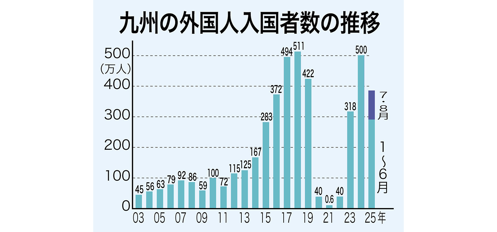 九州運輸局が9月24日に発表した2025年上半期(1〜6月)の九州への外国人入国者数(確定値、クルーズ船含む)は、前年同期比18.0%増の293万8377人だった。これまで最多だったコロナ禍前の18年を15.5%上回り、上半期として過去最多となった。国際航空路線の需要回復や新規就航・増便が押し上げた。